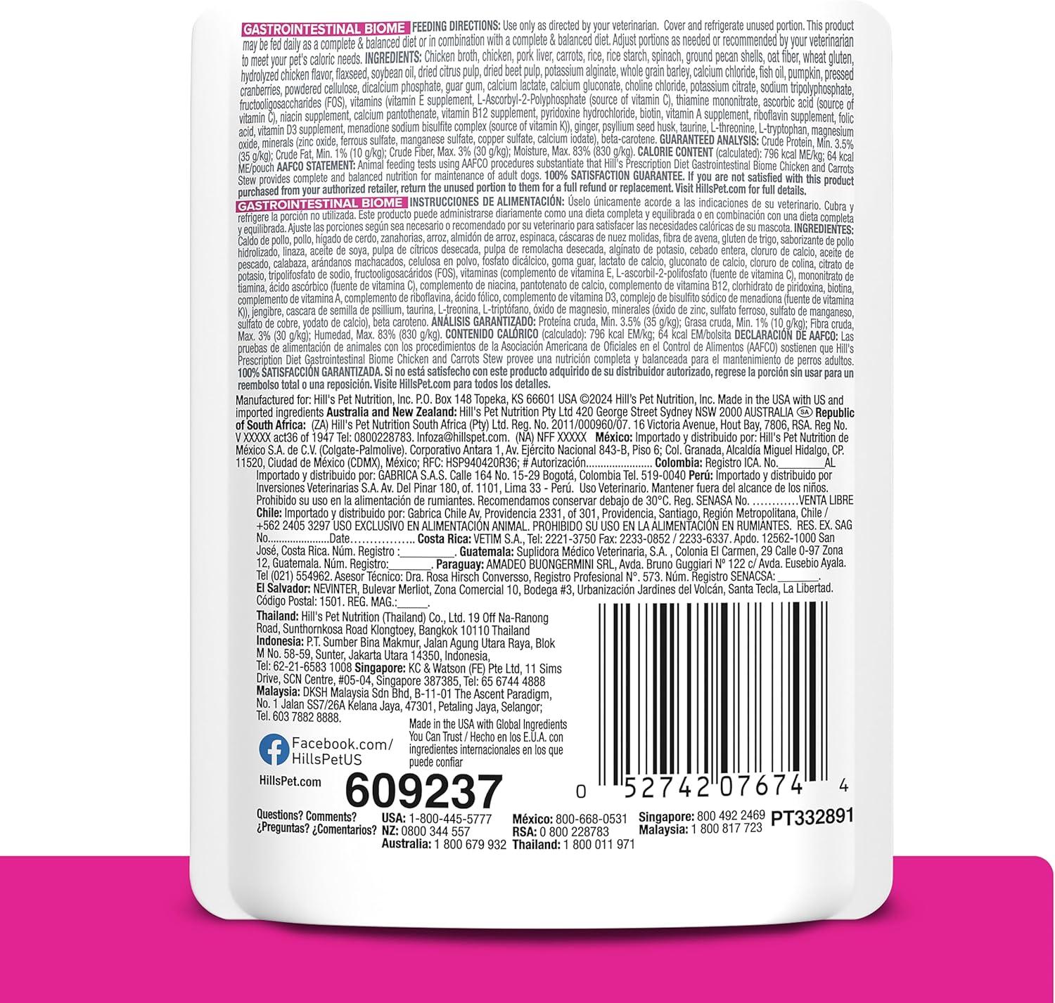 Hill’s Prescription Diet Gastrointestinal Biome Chicken & Carrot Stew Wet Dog Food, 24 x 2.8 oz Pouches